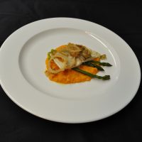 Auf vorgewärmte Teller einen Spiegel mit der Sauce machen. Variante mit kleinen grünen Spargeln den Fisch darauf anrichten. Mit den Zwiebelringen garnieren.