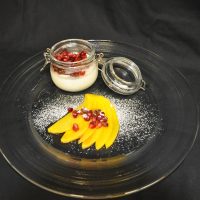 Kokos Pannacotta mit Granatapelkernen und Mango