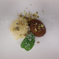 1. Die beiden Mousse mit 2 heiss abgespült Esslöffeln abstechen, auf Tellern anrichten, mit Pistazien verzieren.